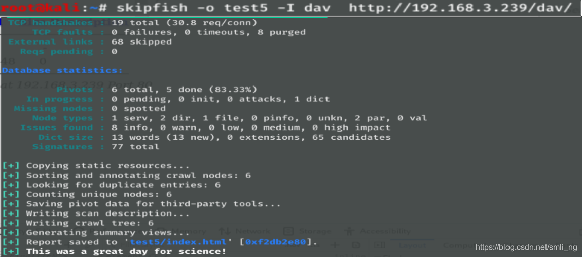 5. 用字典扫描目标来发现隐藏文件。(skipfish自带的字典位于/usr/share/skipfish/dictionaries/)