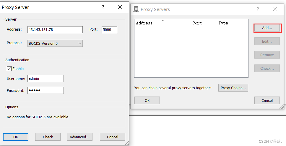 2.然后我们选择添加,然后输入 公网服务器的IP地址和端口,以及frpc.ini文件中的socks5账号和密码 。