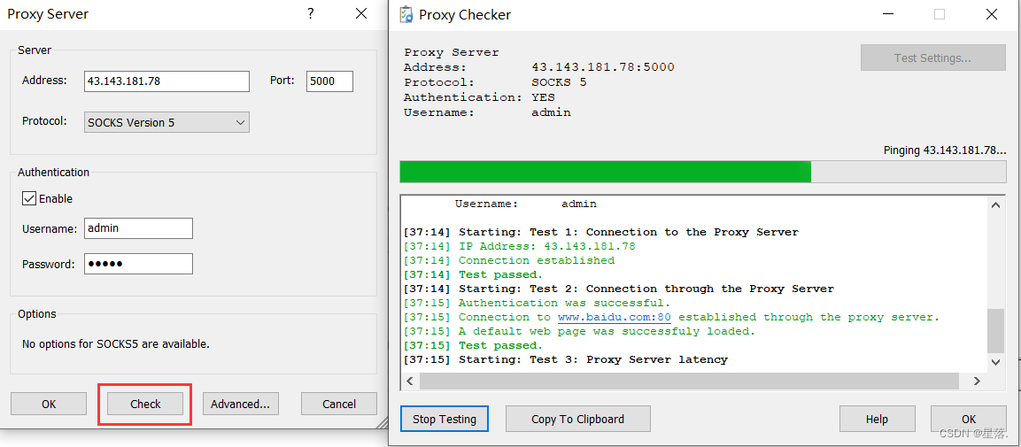 4.然后我们就完成了socks5代理配置,现在自己的电脑全部的流量都会通过内网主机代理出去,我们就可以直接访问内网主机的内网,以及配置渗透工具进行内网渗透。可以看到代理检测成功。