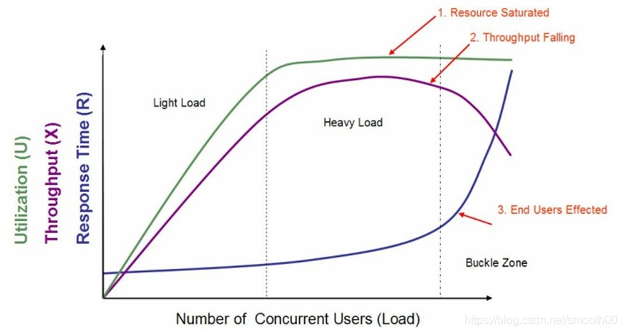 一个系统吞吐量通常由QPS(TPS)、并发数两个因素决定,每套系统这两个值都有一个相对极限值,在应用场景访问压力下,只要某一项达到系统最高值,系统的吞吐量就上不去了,如果压力继续增大,系统的吞吐量反而会下降,原因是系统超负荷工作,上下文切换、内存等等其它消耗导致系统性能下降。