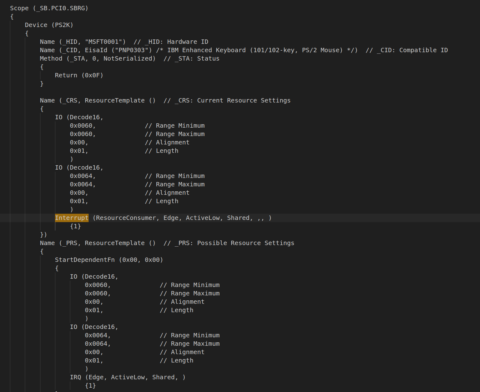 # 搜索并替换 Device(KBC0) 下面的 IRQ (Edge, ActiveLow, Shared, ) 替换为