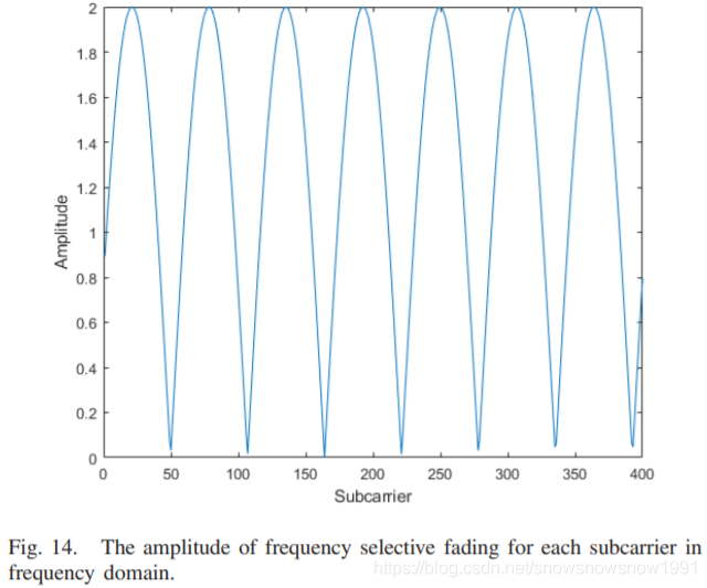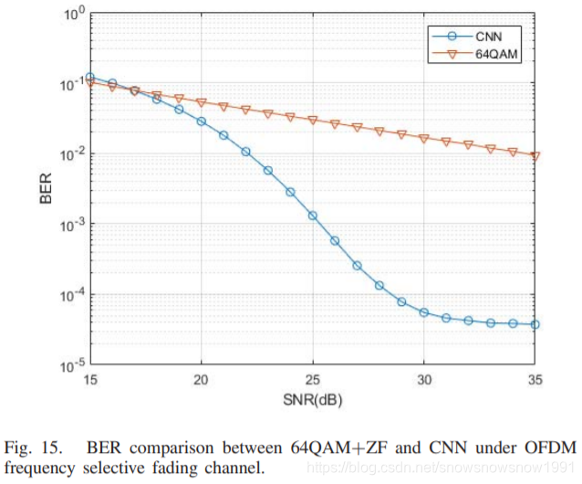 我们在OFDM系统传输的情况下测试了新的结构。比特序列在频域内被调制和传输。所有其他设置与前面的示例相同。我们在图4中考虑信道B的频率变换。频域中的频率选择性衰落信道如图14所示。我们在同一个频道上训练和测试我们的模型。并与64QAM+ZF法进行比较。这里假设ZF具有准确的信道状态信息。但是,衰落图中的零点将禁止大量的子载波向接收机发送信息。