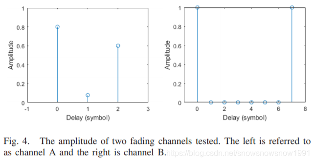 在时域传输系统中,我们测试了三个不同的信道,一个AWGN信道和两个衰落信道。图4中绘制了两个衰落信道的振幅和延迟。x轴中的整数是以符号为单位的每条路径的延迟。注意图中省略了相位信息。