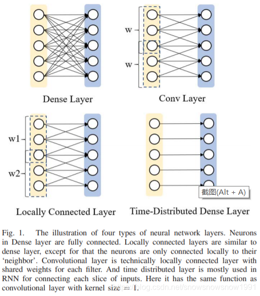 我们要使用的层的结构如图1所示。稠密层是指每个神经元都与上一层的每个神经元相连的层。在卷积层中,每个神经元只与上一层中几个附近的神经元相连(图1中神经元不超过3个),每个神经元的参数是共享的。局部连接层的工作原理与卷积层类似,只是权重是不共享的,即在输入的每个不同的补丁处应用不同的滤波器组。而时间分布稠密层是一个只处理输入的每个时间片而不是输入的所有元素的层。在我们的情况下,它本质上是一个卷积层,内核大小=1。考虑到在通信PHY中的应用,我们将在第三节对稠密层和卷积层进行进一步的比较。
