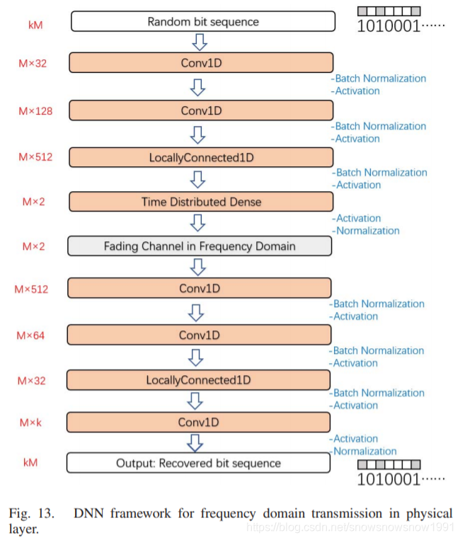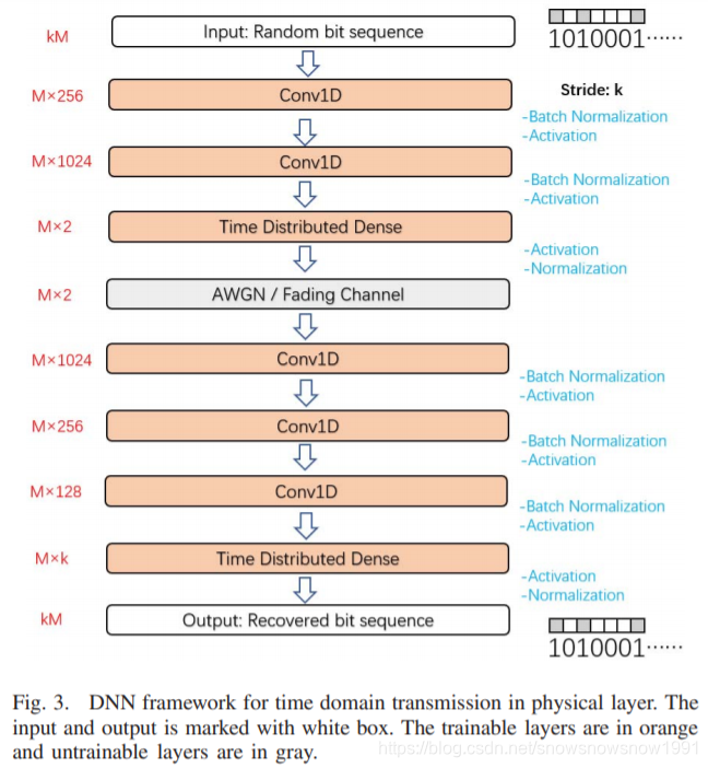 The property of neural network enables us to train the model using only input bit sequences under different channel states. We jointly optimize the transmitter and receiver with an autoencoder structure. Convolutional neural network is used considering the sequential property of the input sequence. The network structure is shown in Fig. 3.