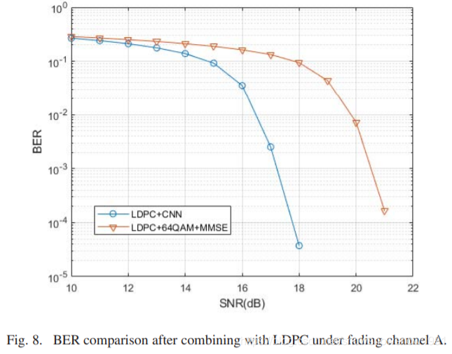 - 在交织的帮助下,CNN-AE还可以与现有的编码方案相结合,进一步提高其性能。前面我们已经展示了它可以与LDPC码结合,如图8。