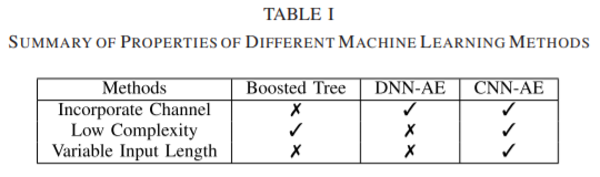 Furthermore, it is also important that the proposed structure is able to be adapted to input with different lengths after training. However, for DNN-AE and boosted tree, one needs to retrain the whole model for input of different lengths. It is natural to adopt a CNN based structure since traditional communication system is mostly on a convolutional or similar scheme (e.g. convolution code, QAM and PSK modulation etc.). We summarized our discussion on different machine learning methods in Table I. Based on the properties of different machine learning methods, we propose to use a CNN autoencoder for joint transceiver optimization for the complexity consideration.