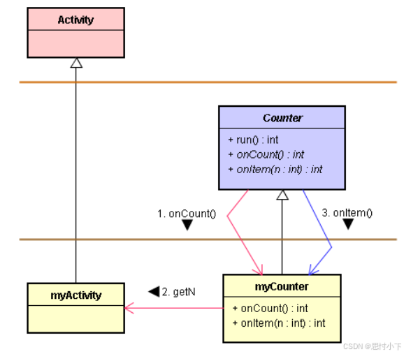 - 依据此图,你必须使用Activity来提供UI上的一个EditText窗口,让User在执行阶段才输入N值。由<E>主动去向Activity的EditText取得N值,然后重复调用<I>的函数,总共呼叫N次,每次回传一个Kn值,再由<E>把它们累加起来。于是,设计出类别架构图,如下: