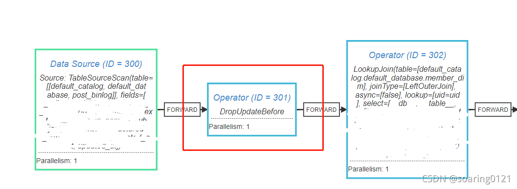 上面的图是不加where语句时flink-cdc的执行计划,和加where语句执行计划的区别就是多了301-DorpUpdateBefore这个算子。原来flink-cdc在upsert-kafka模式下,执行计划在没有where语句时会进行优化,去掉所有的-U数据,这就合理解释了where条件导致的数据差异!