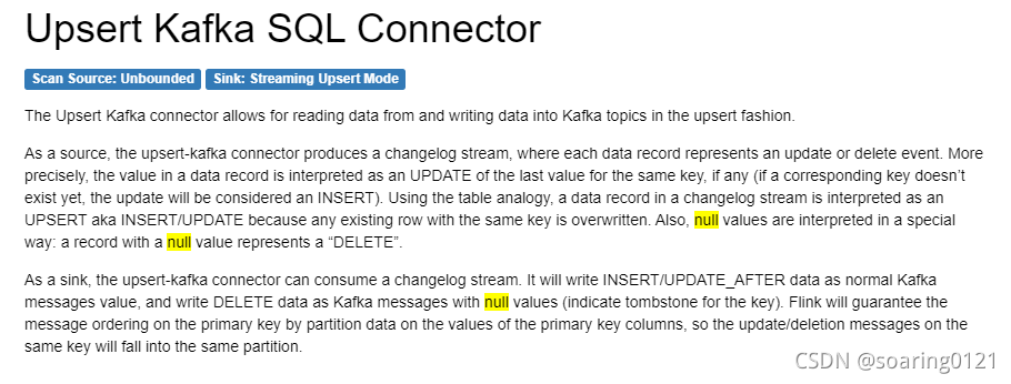 首先,我需要确定null数据是什么。查询官方文档可以知道在upsert-kafka中,会把-D(delete)类型数据写成null。