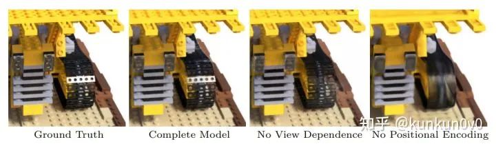 See Fig. 3 for an example of how our method uses the input viewing direction to represent non-Lambertian effects. As shown in Fig. 4, a model trained without view dependence (only x as input) has difficulty representing specularities.