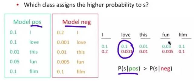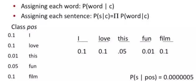 问题变成,这一类中这句话出现的概率是多少,当然,别忘了公式里的另外两个概率。例子:单词“love”在positive的情况下出现的概率是 0.1,在negative的情况下出现的概率是0.001。