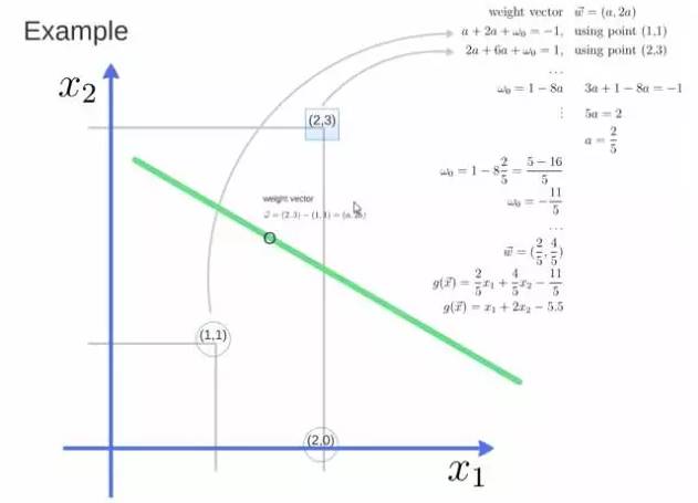 得到weight vector为(a,2a),将两个点代入方程,代入(2,3)另其值=1,代入(1,1)另其值=-1,求解出 a 和 截矩 w0 的值,进而得到超平面的表达式。