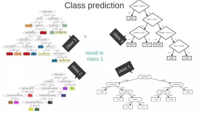 下图,左右两个决策树,单个看是效果不怎么好的,但是把同样的数据投入进去,把两个结果加起来考虑,就会增加可信度。
