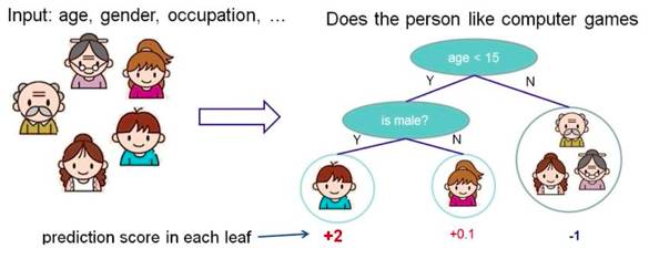 根据一些 feature(特征) 进行分类,每个节点提一个问题,通过判断,将数据分为两类,再继续提问。这些问题是根据已有数据学习出来的,再投入新数据的时候,就可以根据这棵树上的问题,将数据划分到合适的叶子上。
