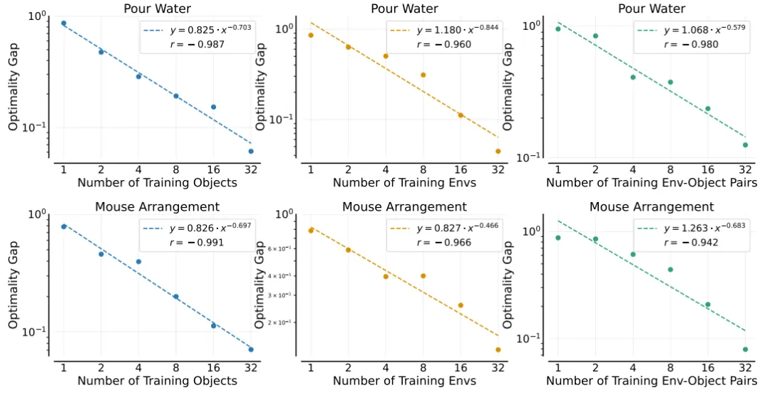 更为复杂的是,模型在应对环境-物体组合时的泛化能力,与训练中所接触的“环境-物体对”的数量之间,亦遵循幂律关系。