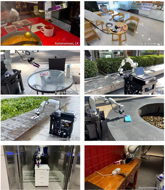 研究团队借助便携式手持夹爪UMI,在丰富多样的真实环境中精心收集了超过4万条人类演示数据。这些数据广泛覆盖了火锅店、咖啡厅、公园等多种日常场景,更不乏喷泉旁、电梯内等独特环境,为模型训练提供了丰富的素材。