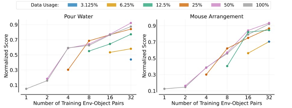 在环境泛化实验中,研究者固定训练物体数量,逐步增加训练环境数量,并深入评估模型在未见环境中的表现。此实验旨在探究模型对新环境的泛化能力如何随训练环境数量的增加而增强。