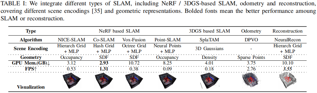 ▲表格1|集成不同类型的SLAM,包括基于NeRF/3DGS的SLAM、里程计和重建,涵盖了不同的场景编码和几何表示©️【深蓝AI】编译