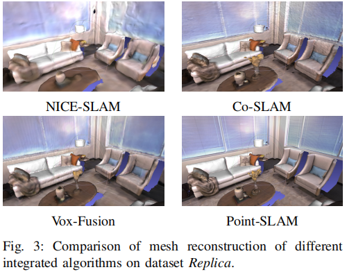 图3显示了集成到XRDSLAM中的若干种SLAM方法在Replica/room0数据集上进行网格重建的定性结果,其性能逐步提升,从NICE-SLAM、CO-SLAM、Vox-Fusion到Point-SLAM。