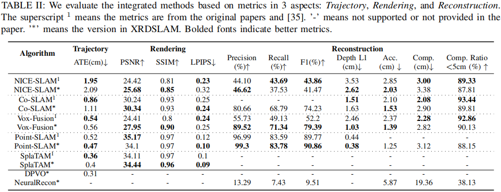 表格2显示了多种原始算法及其集成版本(带“*”)在8个Replica数据集上的指标平均结果。原始算法和XRDSLAM集成的算法之间更好的结果以粗体表示。完整的评估表格可以在github仓库中查看。