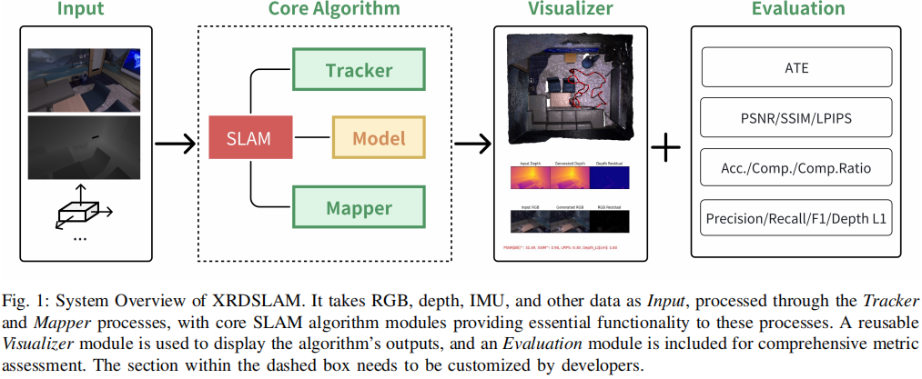 然而,随着新论文和技术的不断涌现,跟踪进展和集成代码变得越来越具有挑战性。很多研究实现分散于独立的代码仓库中,缺乏统一的开发和评估过程。这使得公正且全面的比较变得非常困难。此外,SLAM系统的复杂度为从头开始构建完整的SLAM系统带来了很高的技术障碍和开发成本。受到NeRFStudio在NeRF领域中的成功启发,本文引入了XRDSLAM,这是一种用于基于深度学习SLAM的可扩展且多功能的框架。本项工作的主要贡献如下: