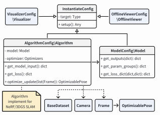 1)Config:与NeRFStudio一样,XRDSLAM使用配置类来组织和管理SLAM算法的参数和组件。该配置类继承自InstantiateConfig,并且通过setup方法来动态实例化相应的对象。系统中的每个组件均可以通过统一的方式来配置和实例化。XRDSLAMerConfig集中管理与SLAM运行相关的所有参数,并且通过该配置类,用户可以方便地控制SLAM系统的行为,简化参数管理和调试过程。配置类的使用不仅提高了代码的可读性,还增强了系统的灵活性和可扩展性。