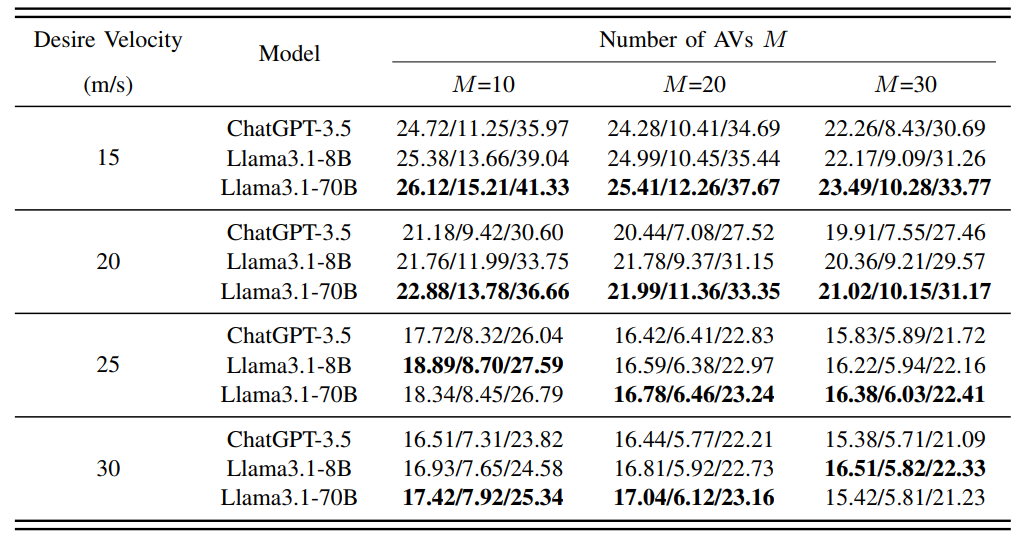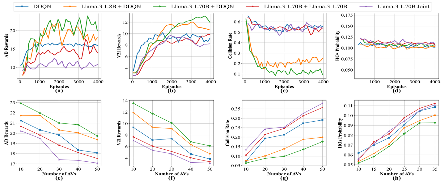 仿真结果表明,混合LLM-DDQN方法比传统的DDQN方法表现更优,尤其是在收敛速度和学习效率方面。此外,较大的LLM模型(如Llama3.1-70B)在处理复杂任务时展现了更强的推理和优化能力,从而显著提升了整体系统的性能。尽管随着自动驾驶车辆数量的增加,系统面临更大的资源竞争和交通拥堵问题,但该方法仍能保持较低的碰撞率和较高的数据传输速率,展现出其在高负载环境下的鲁棒性。