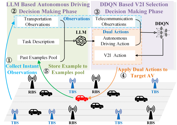 这一过程会持续进行,直到系统的行为收敛。通过这种迭代优化方法,LLM和DDQN可以有效地学习并优化自动驾驶和V2I通信系统中的决策。