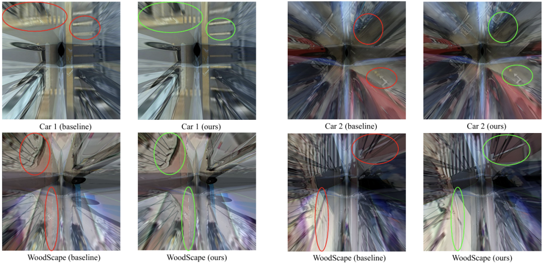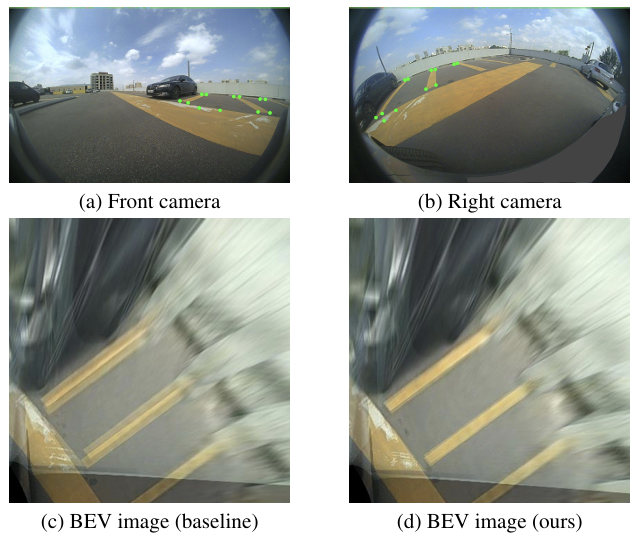 生成的BEV图像覆盖了车辆周围25m×25m的范围。与基线相比,Click-Calib提供了相邻相机之间更好的对齐,从而证明了其高精度。