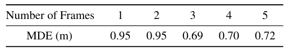 MDE在使用三帧时明显降低,并且在使用三帧以上时稳定。这种改进可以归因于两个主要因素。首先,额外的帧提供了更多的关键点以及自车周围更广泛的覆盖范围,从而降低了仅使用一帧的过拟合效应。其次,更多的帧还有助于平滑地面的不平坦区域,从而实现更精确的标定结果。