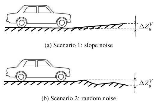 该仿真使用单帧标定在汽车1上进行。本实验关注两个典型场景:斜坡情况和随机情况。为了简化分析,假设自车的四个车轮形成的平面是完全水平的。在斜坡情况下,自车被两侧高度为的斜坡围绕。在随机情况下,车辆停在颠簸的道路上,地面上每个点的高度随着随机噪声变化,最大可达