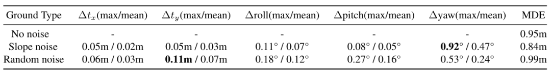 地面点高度的噪声仅在标定中引入微小差异。这些差异可以认为是Click-Calib的标定误差的近似上限,这是因为误差的主要来源是地面点的高度。有趣的是,斜坡情况下的MDE甚至比无噪声情况下更小。本文认为,这是因为假设的斜坡与实际斜坡部分符合所导致的。