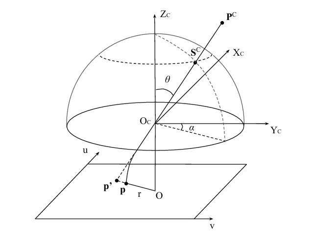 为了描述鱼眼透镜的强径向畸变,本文提出了若干种几何模型。这些模型可分为四类:经典几何模型、代数模型、球面模型和其它模型。为了便于实现投影函数,本文采用了代数模型。具体而言,本文使用四阶多项式: