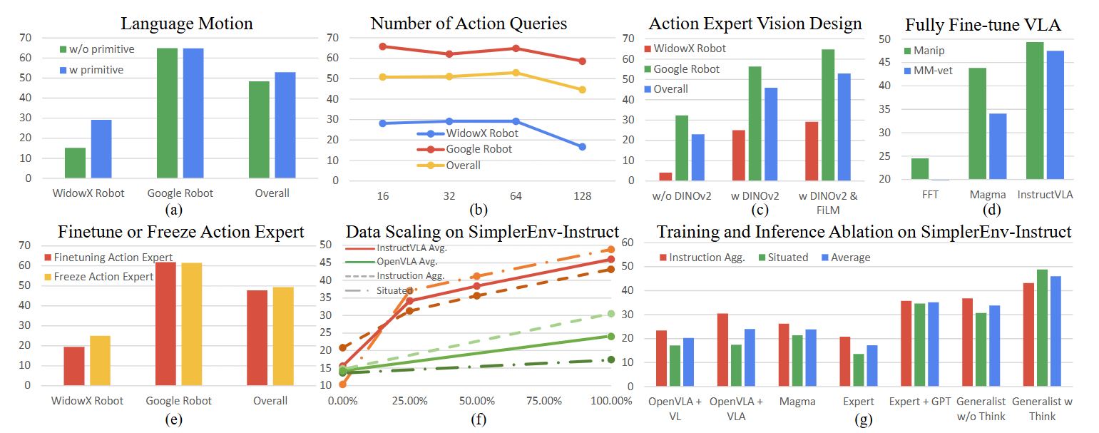 图7|消融实验从两个角度展开分析:(a-d) 动作能力集成:评估在数据设计(如语言引导的运动描述)、表示方式(如潜在动作 token)、视觉编码器结构以及微调策略等方面的设计选择,如何影响机器人操控性能。(e-g) 多模态能力迁移:探讨视觉语言理解能力是如何通过“从视觉语言到动作”的学习方式、指令数据规模扩展,以及推理时的“思考”机制,在操控任务中发挥作用的
