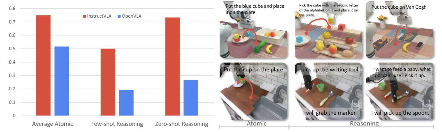 ● 提出 InstructVLA 架构与训练流程,强调语言能力在 VLA 系统中的核心地位,在保留预训练视觉语言能力的同时,将机器人操作纳入指令跟随体系;