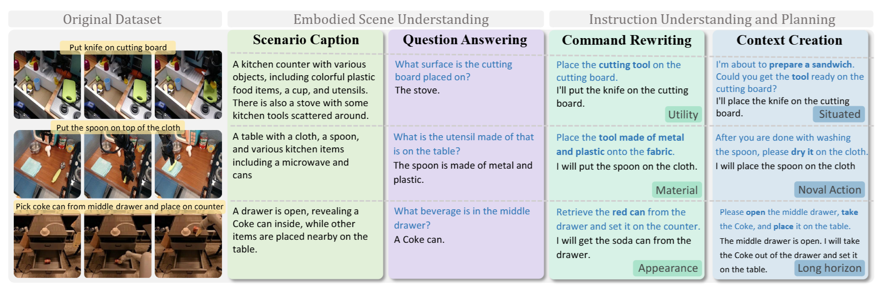 尽管这些 VLA 模型在操作任务中展现出良好的性能,但在微调过程中仍面临“灾难性遗忘”问题,即原本继承自预训练 VLM 的多模态推理能力逐渐衰退。这一问题的根源主要有两点:其一,现有的大规模真实机器人数据集在任务场景与语言指令的多样性上严重不足,训练往往局限于模板化的简单指令(如“打开抽屉”);其二,仅使用具身操作数据进行微调容易破坏模型原有的通用语义理解能力,削弱其对多样化输入、用户反馈和自然语言指令的适应性。