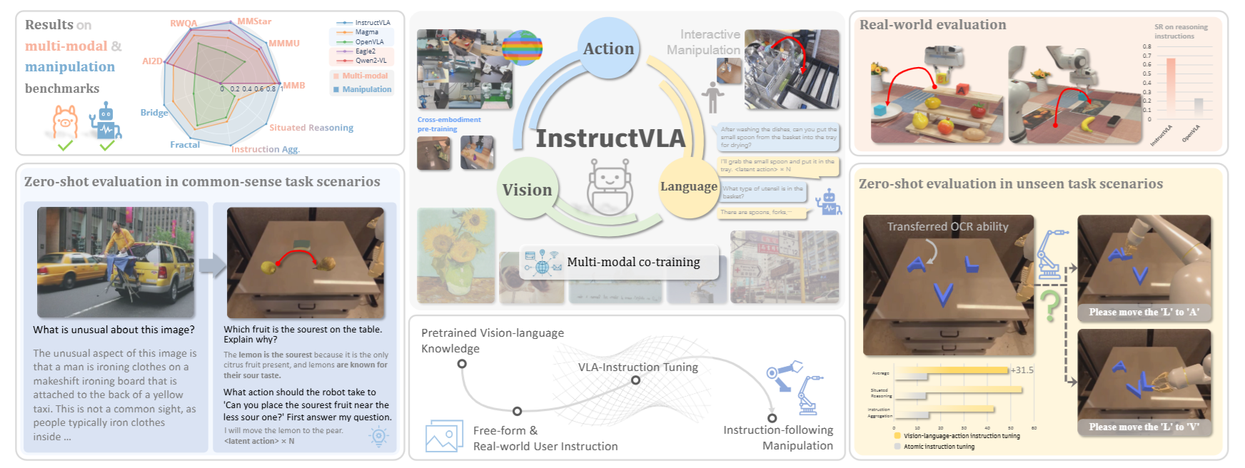 图1|InstructVLA 将强大的多模态理解能力与精准的指令驱动机器人控制相结合,充分利用了视觉语言模型(VLM)所蕴含的世界知识。其核心训练策略——视觉-语言-动作指令微调(vision-language-action instruction tuning)——通过在动作生成之前先进行视觉语言推理,有效提升了机器人操控能力