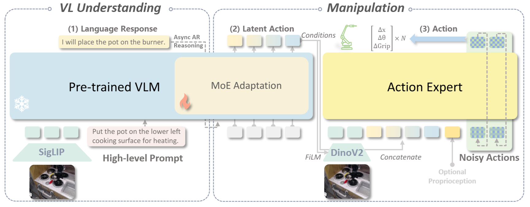 关键挑战在于使模型在推理与操作之间灵活切换。为此,作者采用了专家混合机制(Mixture-of-Experts, MoE),根据输入语境与推理模式自适应地调整各专家模块的权重,实现多模态推理与语言驱动操作之间的融合。在具体实现中,作者使用 LoRA 模块作为 LLM 主干中的多个专家,既保留预训练能力,又保证推理效率。一个“scale head”模块根据隐状态预测每个专家的门控系数,从而对多个专家输出进行加权融合。