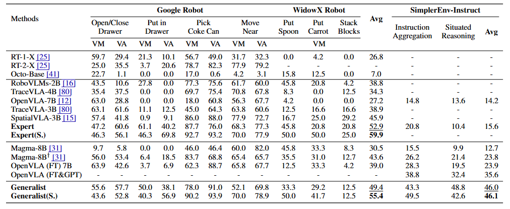 作者基于视觉指令微调的思路,提出了一种简洁的训练方式。在动作专家已经具备模仿 VLM 潜在动作的能力之后,进一步微调 LLM 主干,使其能处理更复杂的操作指令并生成合理响应。在此阶段,动作专家保持冻结,仅新增语言 LoRA 模块和 MoE 模块中的 scale head。MoE 模块是唯一的可训练部分,共约 2.2 亿参数。本阶段使用的数据将 VLM 预训练能力与具身任务桥接,并融合多个多模态数据集联合训练,最终得到的模型被称为“Generalist”,即具备通用语言理解与操作能力的模型。