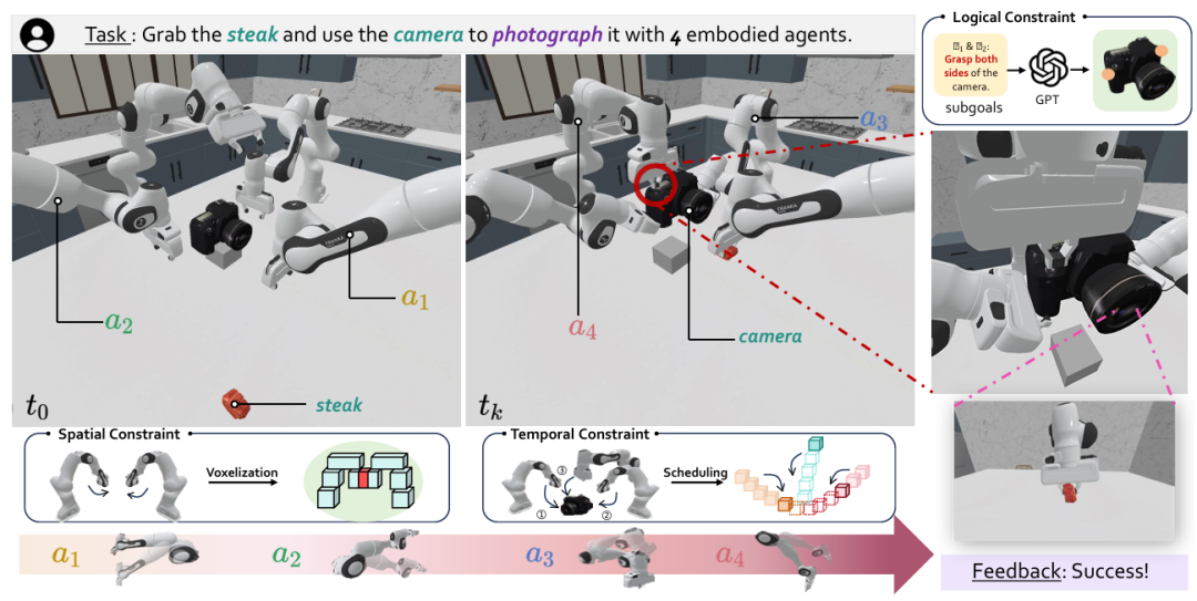 其核心是:引入逻辑、空间和时间这三类组合约束,以此解决多智能体协作时的安全与效率难题,并开发了自动化数据收集框架,构建了首个具身多智能体操作基准。