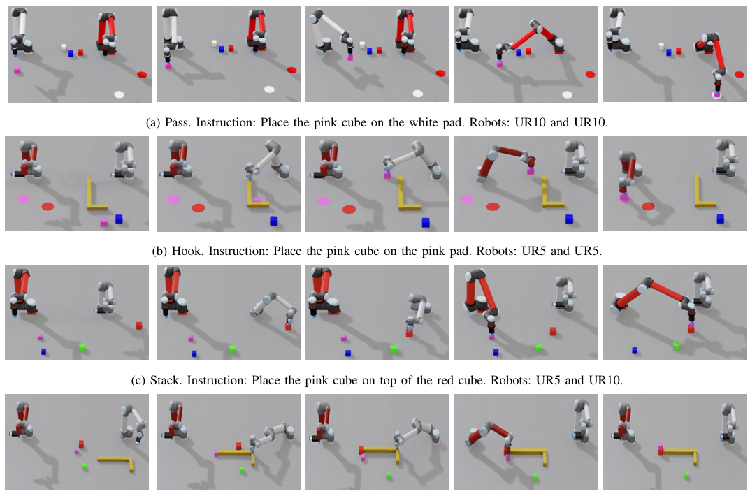 它优势在于:通过设计适配不同约束的接口,将文本约束转化为可与物理世界交互的形式,实现了安全高效的数据生成;同时基于此基准对模仿学习方法进行适配与评估,探索多智能体模仿学习的架构和训练策略,填补了多智能体协作操作领域基准和高效数据生成方法的空白。