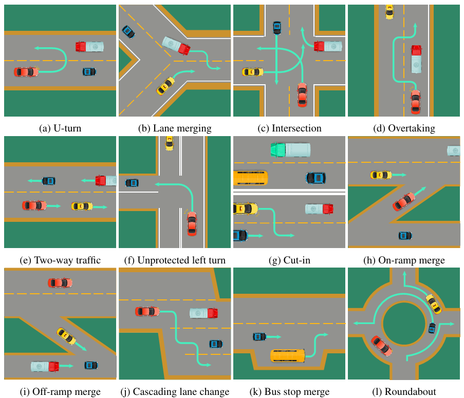 SMARTS是一个用于自动驾驶多智能体强化学习的基准,它支持复杂交通场景(如无保护左转、高速公路合并)。