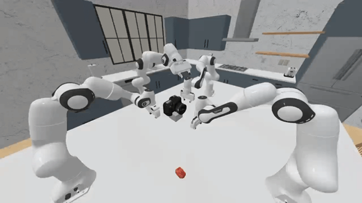 该基准测试专注于基于语言指令的双机械臂协作任务,它包含了8个桌面操作任务(例如:“组装玩具车,强制要求2只手臂协作完成任务,比如其中一个机械臂需要好固定零件后,另一个手臂才能拧紧螺丝”)。