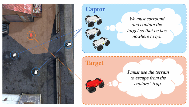 该基准通过“绝对安全区”(ASZ)来量化围捕效果,评估智能体之间的策略协同(如分工封堵不同出口)与环境利用(如利用障碍物限制目标移动)的能力。
