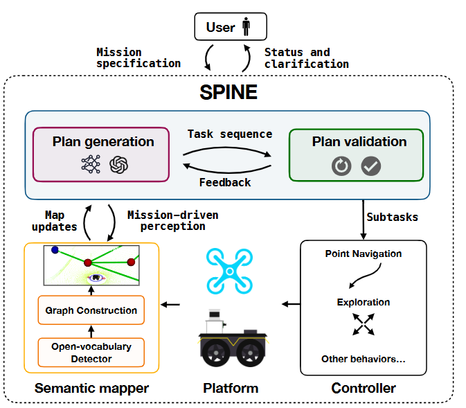 大模型负责解析自然语言任务、推理目标地点与行为序列,输出一系列“函数调用”(如 goto(park)、explore(region));这些调用由传统控制栈中的子模块执行,如路径规划、障碍避让、地图更新等。