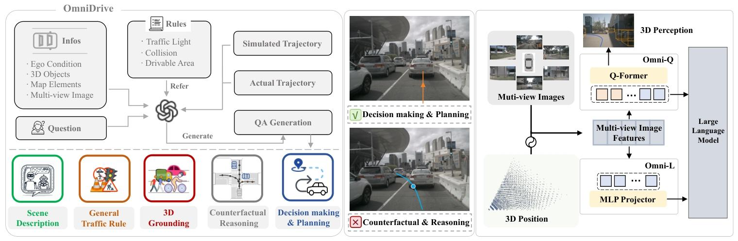 为了大规模生成高质量标注,团队设计了一条基于反事实的自动合成管线,把规划轨迹与语言解释牢牢绑定,显著提升了监督信号的密度。围绕这套数据,他们又打造了两大智能体框架——Omni-L 与 Omni-Q,专门用来验证“视觉-语言对齐”对三维感知究竟有多重要,也为后续大模型智能体的设计提供了宝贵经验。