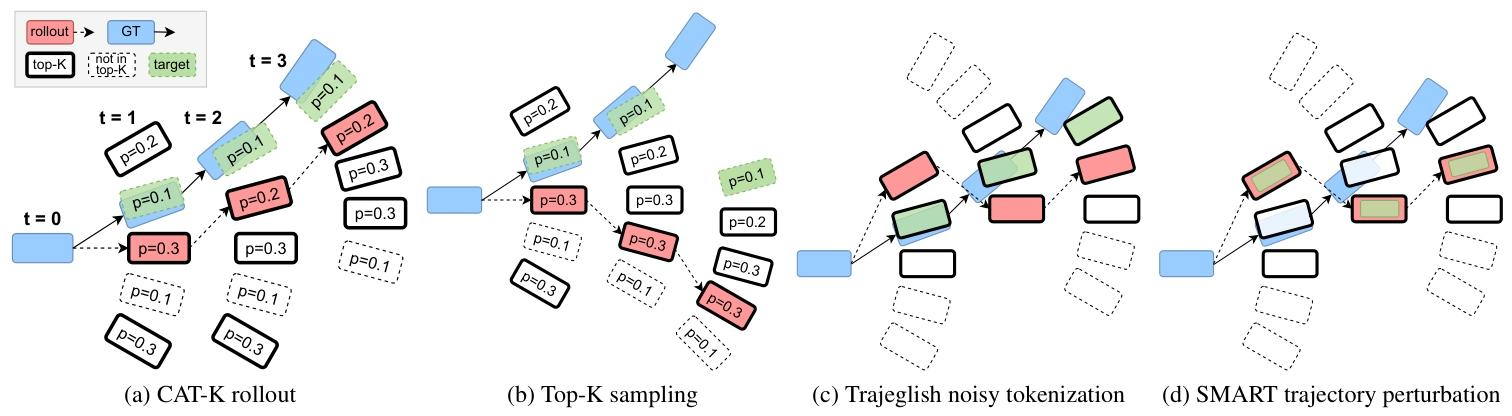 NVIDIA Research团队提出了一种极简而高效的闭环微调策略——“Top-K 中最接近者(CAT-K)”。它无需强化学习,也无需对抗模仿,只用既有轨迹数据即可完成。经过 CAT-K 微调,一个仅 700 万参数的小型 token 化交通模型,便一举击败同族 1.02 亿参数的“大个子”,在提交时登顶 Waymo 仿真智能体挑战赛排行榜。