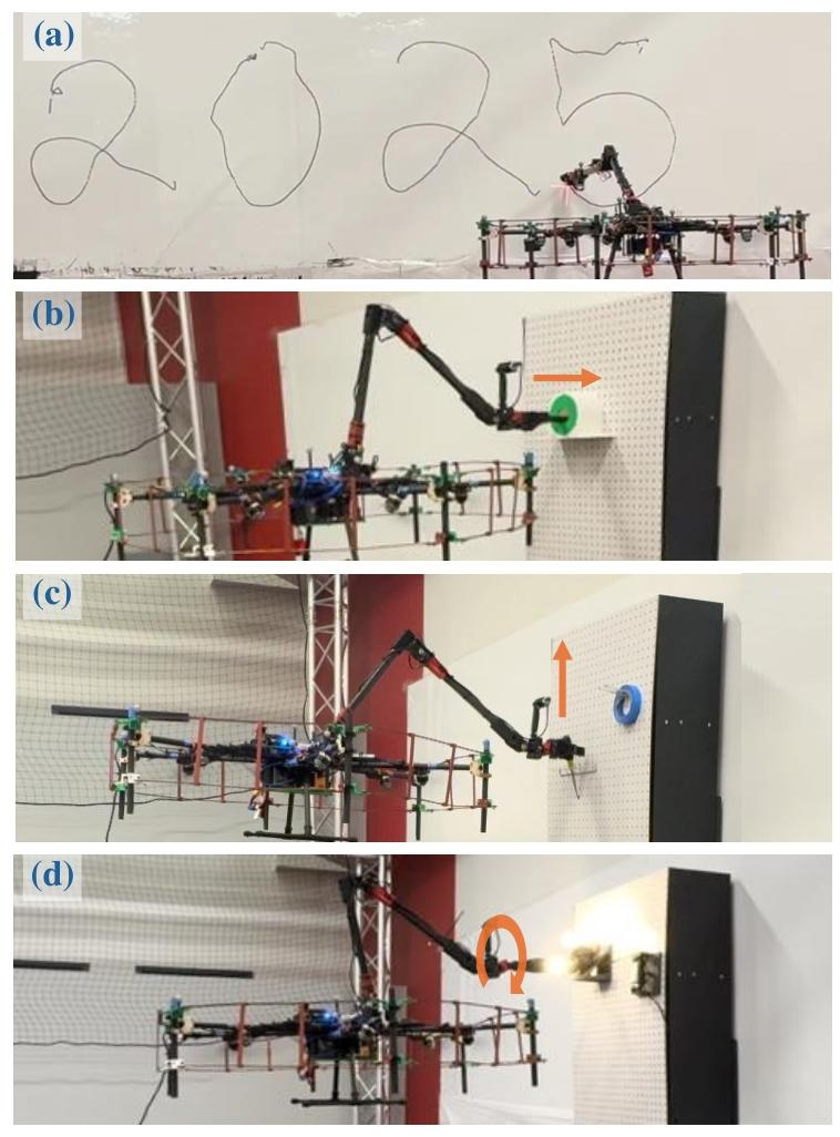 论文内容:针对现有空中操作机器人通常为特定任务设计,缺乏通用性的问题,作者提出了一个名为“飞行之手”(Flying Hand)的统一框架。该框架由三部分构成:一个硬件平台(包含一台全驱六旋翼无人机和一个四自由度机械臂),一个以末端执行器为中心的底层全身模型预测控制器(MPC),以及一个高层策略模块 。其核心思想是通过一个末端执行器中心接口,将复杂的底层控制与上层任务决策分离 。底层控制器采用MPC来协同优化无人机和机械臂的运动,以精确追踪末端执行器的目标轨迹 ,并通过L1自适应控制来实时补偿模型不确定性和外部扰动,从而保证了高精度的追踪性能。在高层,该框架支持两种策略输入:一是直观的遥操作界面,允许操作员像控制自己 свободно移动的手一样直接控制末端执行器的位姿 ;二是一个基于模仿学习的自主策略,通过学习人类操作员的演示数据来训练机器人自主完成任务,这也是模仿学习首次被成功应用于空中操作领域。大量的真实世界实验,如空中写字、穿针、拧阀门和换灯泡等 ,验证了该框架的卓越性能、遥操作的便捷性以及学习策略的有效性 。