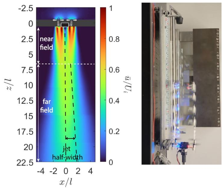 论文内容:针对多四旋翼无人机在密集编队中因下洗流干扰而导致性能下降和失稳的重大挑战,作者进行了一项综合性的数据驱动研究,旨在深入表征、分析和理解该效应。研究采用了一套精密的实验装置,通过改变两架Crazyflie无人机的相对水平和垂直间距,使用六轴力/力矩传感器精确测量了静态分离下无人机间相互作用的力和力矩。同时,研究利用粒子图像测速技术(PIV)对单个及成对无人机下方的下洗流速度场进行了高分辨率的量化测绘。研究发现,在垂直堆叠配置下,下方无人机的推力会因上方的下洗流而显著降低,损失可达其悬停推力的35%,而水平偏移则会产生巨大的失稳俯仰力矩。一项核心发现是,单个无人机下方的独立旋翼射流会在特定距离外合并成一股统一的湍流射流,并且其远场行为与经典湍流射流理论的标度律高度吻合,即便在无人机运行的较低雷诺数下也是如此,这为建立簡洁的代数模型提供了理论依据。此外,论文还通过一个定制的动态测试平台研究了无人机在相互接近和远离过程中的动态力,揭示了分离速率对相互作用力的显著影响。这项工作最终形成了一个宝贵的开源空气动力学数据集,为未来开发能够在复杂下洗流区域内稳定飞行的先进多机控制器奠定了基础。